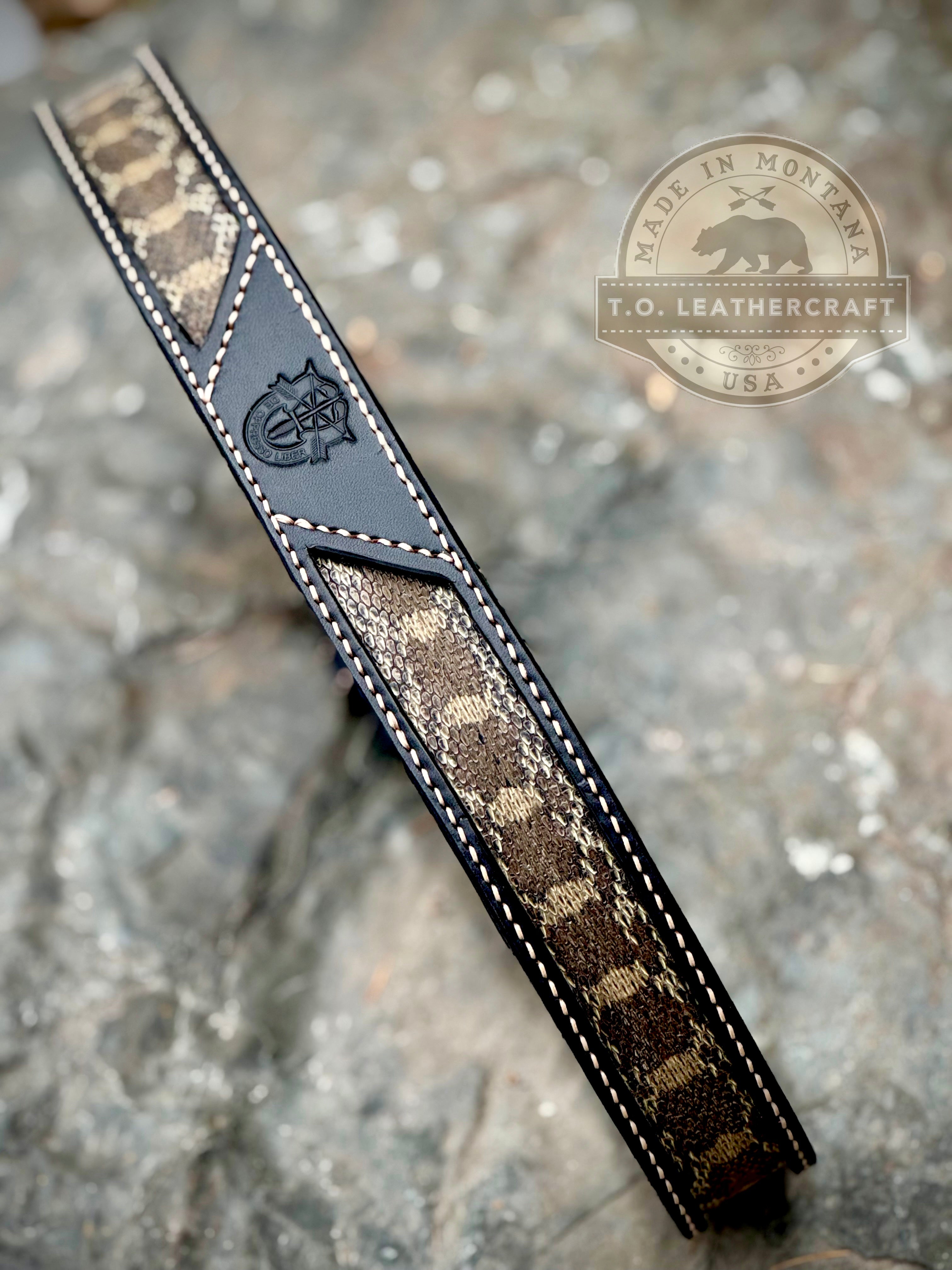 be inlaid between the two belt layers. I keep a wide variety of inlay options on-hand, and work with several distributors of ethically sourced skins and furs from around the world. I can provide photos of what I have on-hand, or find what you are looking for through my exotic materials suppliers.