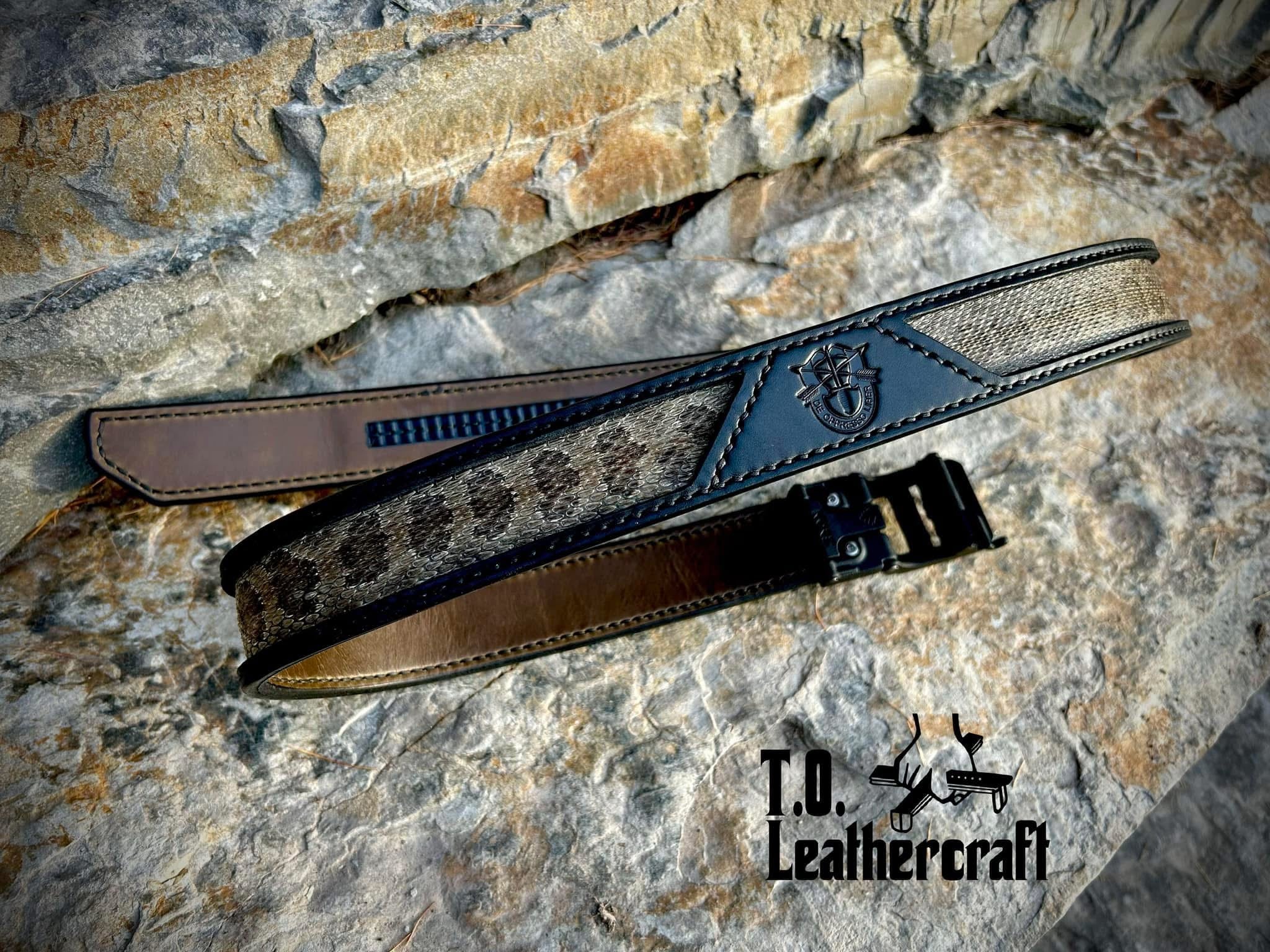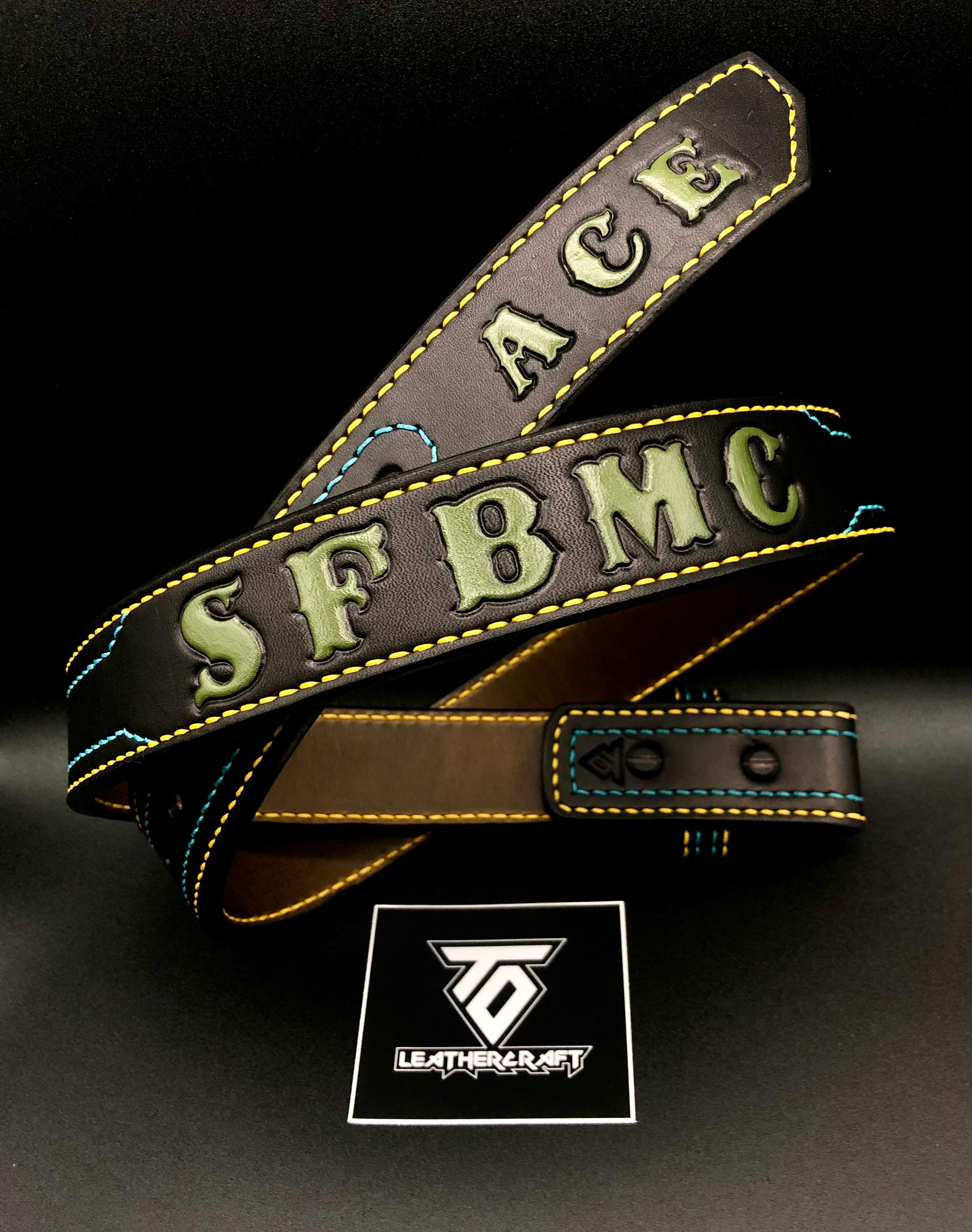 What really sets my belts apart are my custom options. You can have numbers, phrases, names, initials, or logos stamped onto the inside or outside strap. If you want color I can hand paint your stamping. I can hand-carve designs into the leather, or do a form of stitching or pattern you'll never see anywhere else. I can do inlaid exotic skins or contrasting leather.